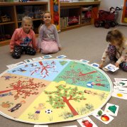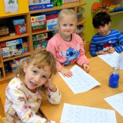 Společně jsme si povídali o ročních obdobích a zastavili jsme se u zimy. Děti ji poznávaly podle typických znaků, pomocí štětců "bruslily" v mouce a nechyběla soustředěná práce.